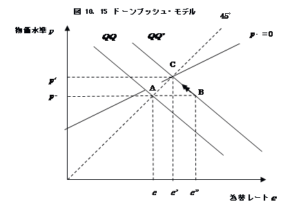 最終的には、dp/ dt=0となる均衡点に収束する。dp/ dt=0を偏差p-p⁻、y-y⁻、e-e⁻で表す。