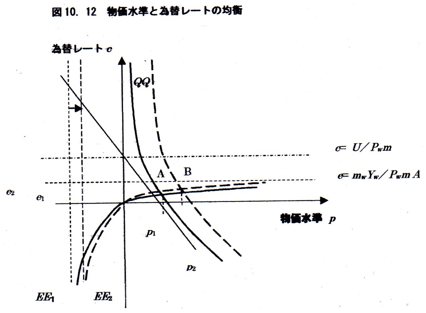 、A=(1-α)K0/w 0 をADに代入すると3市場が均衡する価格と為替レートの組み合わせであるQQ線が導かれる。